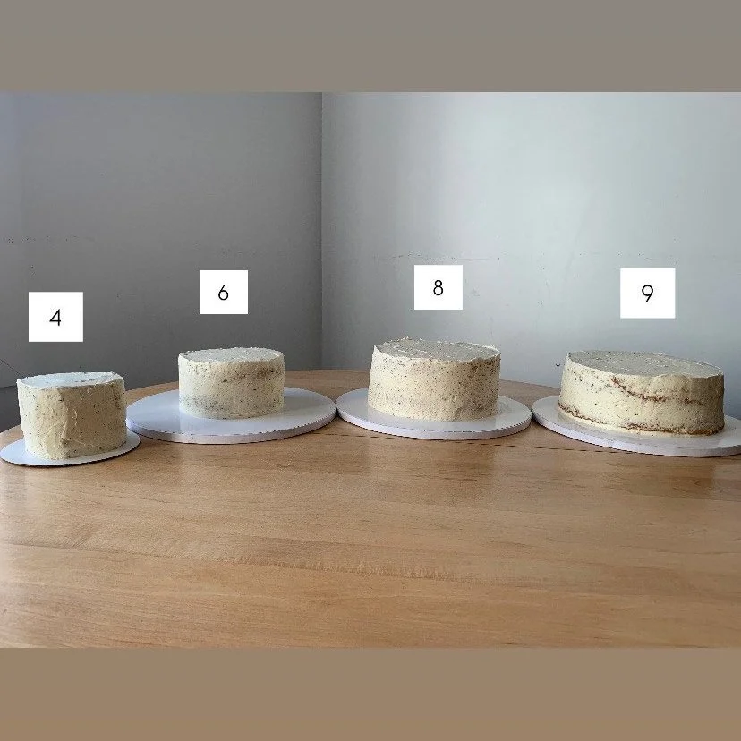 This depends on the number of people you want to feed. Typically a 4 inch, two layer cake feeds 1-4 people. A six inch cake, three layer cake feeds 10-15 people. An eight inch, three layer cake feeds 20-30, and a ten inch, three layer cake feeds 35-45 people. I usually make my cakes three layers, this is customizable.