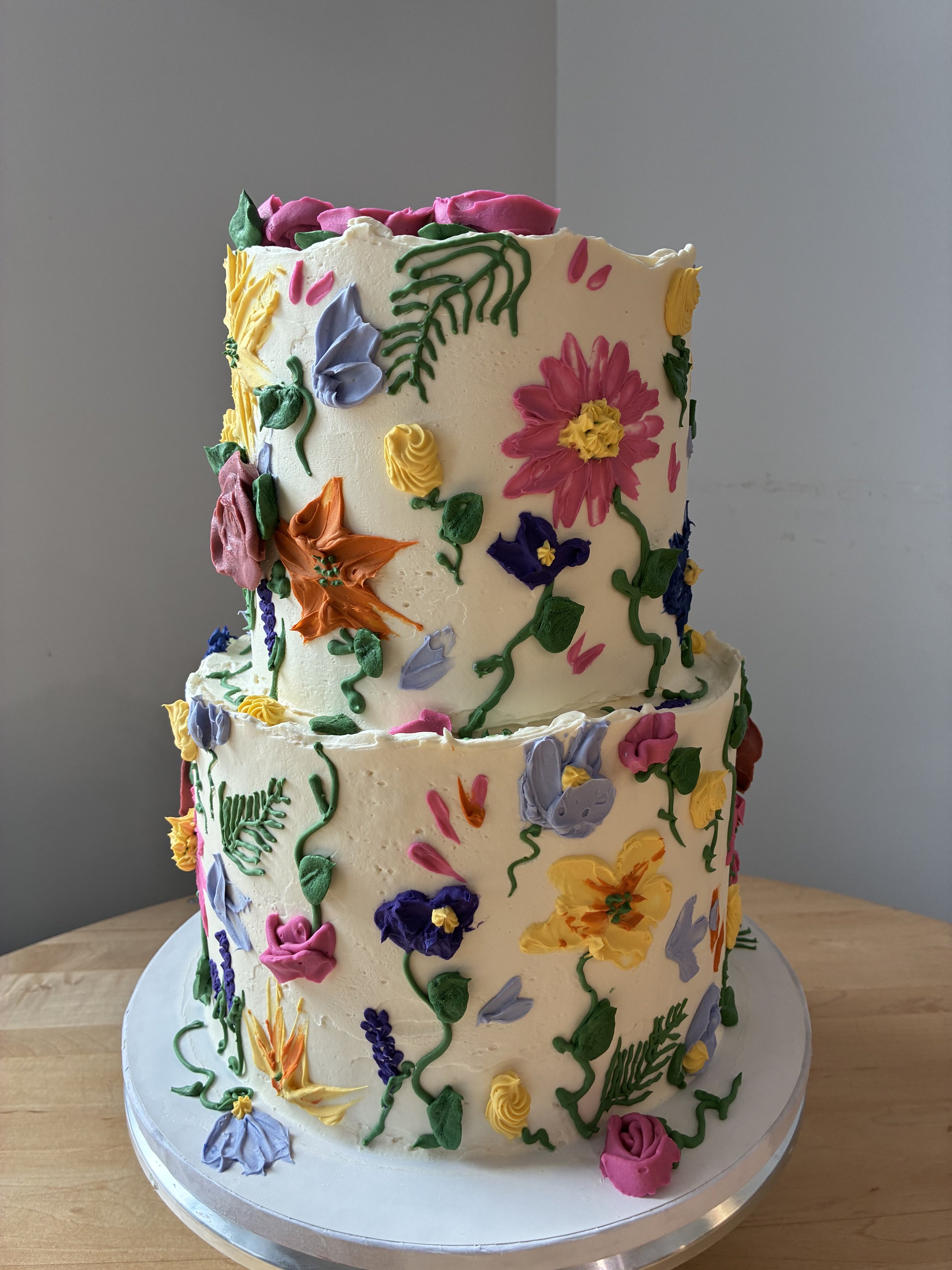 “Layers” are the circles of cake, so usually my cakes have: cake layer, buttercream, filling, cake layer, buttercream, filling, cake layer buttercream. “Tiers” refer to the amount of cakes stacked on top of each other. So a three tiered cake would have a 9 inch cake, 6 inch cake and a 4 inch cake standing on top of eachother.